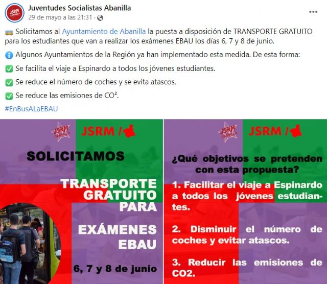La agrupación juvenil pide al Ayuntamiento de Abanilla la puesta a disposición de transporte gratuito para aquellos estudiantes que van a hacer los exámenes de la EBAU los días 6,7 y 8 de junio.