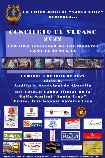El próximo domingo 3 de julio tendrá lugar en el Auditorio de Abanilla el tradicional concierto de verano que la Banda Titular de la Unión Musical "Santa Cruz" ofrece desde su constitución en 1994. En esta ocasión, el nuevo Director desde septiembre de 2021, José Manuel Navarro Egea, ha preparado un repertorio de bandas sonoras de películas que estará acompañado de imágenes relacionadas con la música. Como en años anteriores y en el intermedio, se realizará una presentación-resumen de fotografías de las actividades realizadas a lo largo de los cursos 2019-2022.